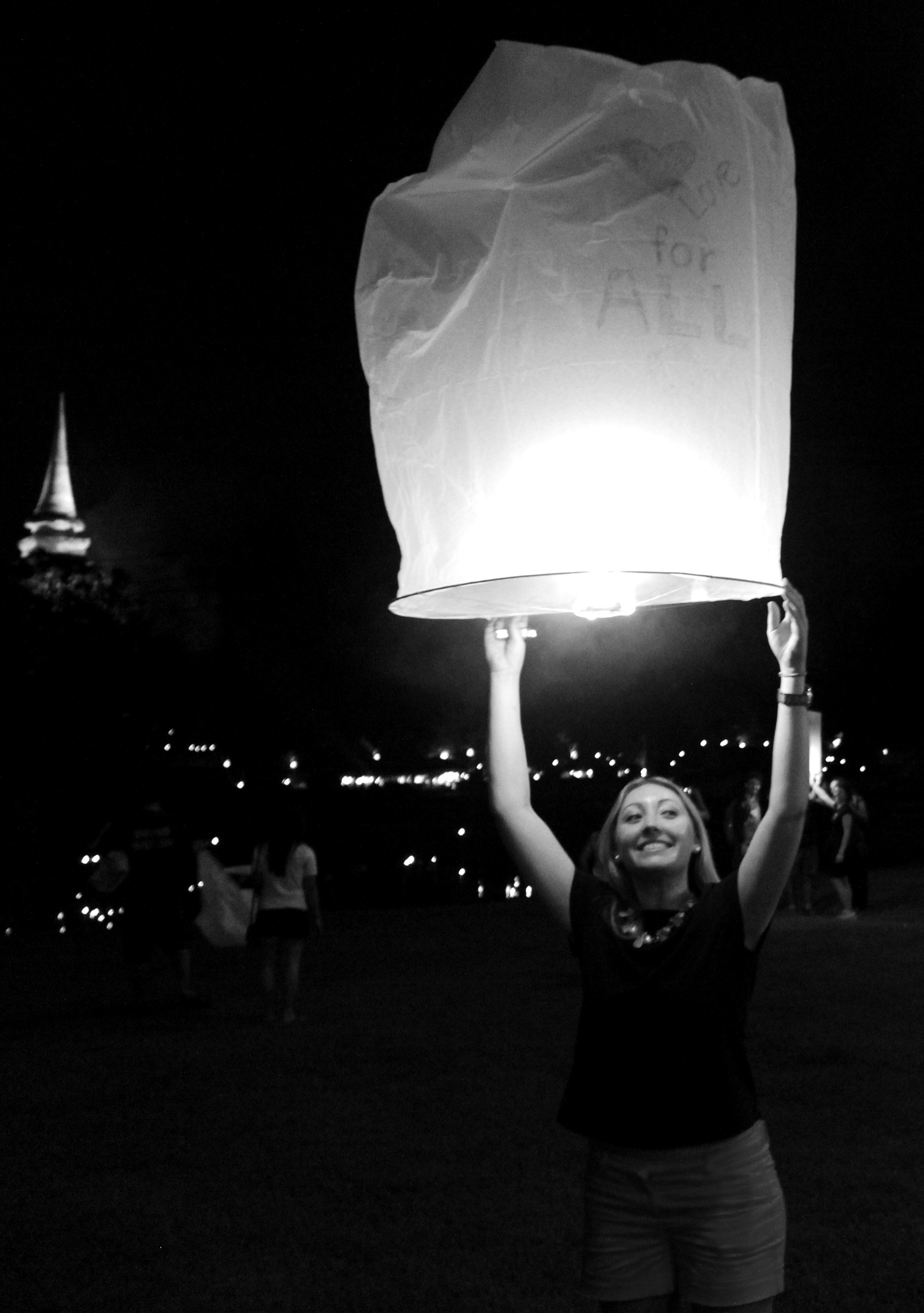 After checking in to Pai we jumped on a tuk tuk truck (think hop-on hop-off bus Thai style) for 30 baht each and made our way to Old Sukothai where all of the festivities are held. (Truly, there isn’t too much to do in the new city so all visitors spend their time in Old Sukhothai.) This took about 30 minutes as, per the usual ,we made many stops. The locals also use these trucks so we saw many faces getting on and off as they headed home or to work. We arrived at the park and walked in. Little did we know you had to have an entrance ticket – so off we went to the Ticket counter to get ours. Foreigners 100 baht, Thais 20 baht. We’re constantly “discriminated” against when it comes to purchasing things and it’s one of the many first things you learn to accept here. Sarah and I laugh every time because this would neverrr fly in the States. For the Thai’s, it’s just the way it is and it’s nothing personal. I think.