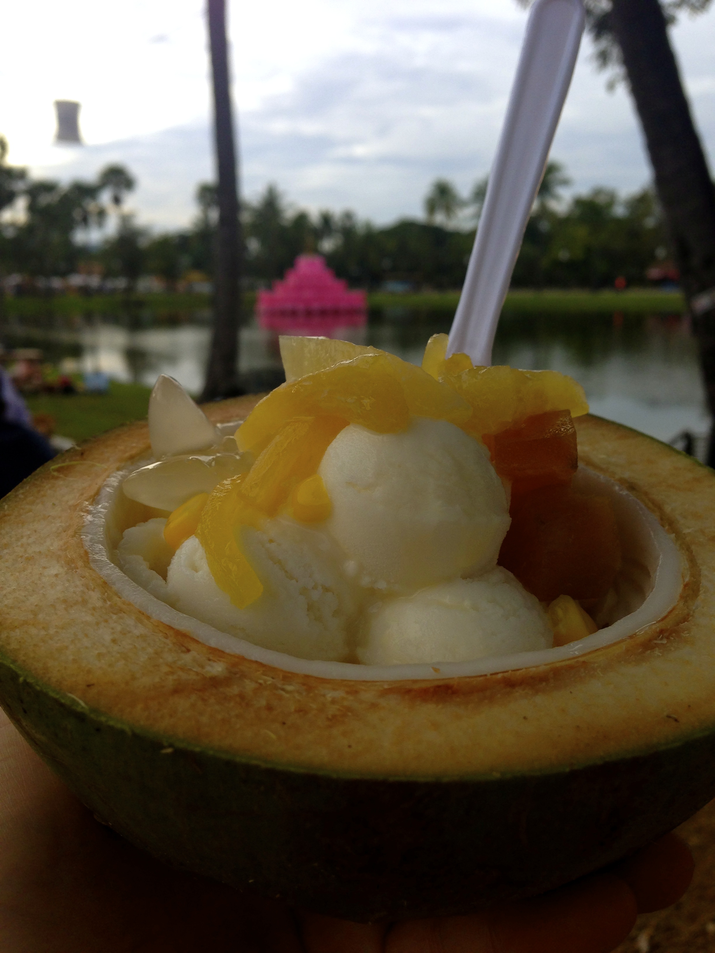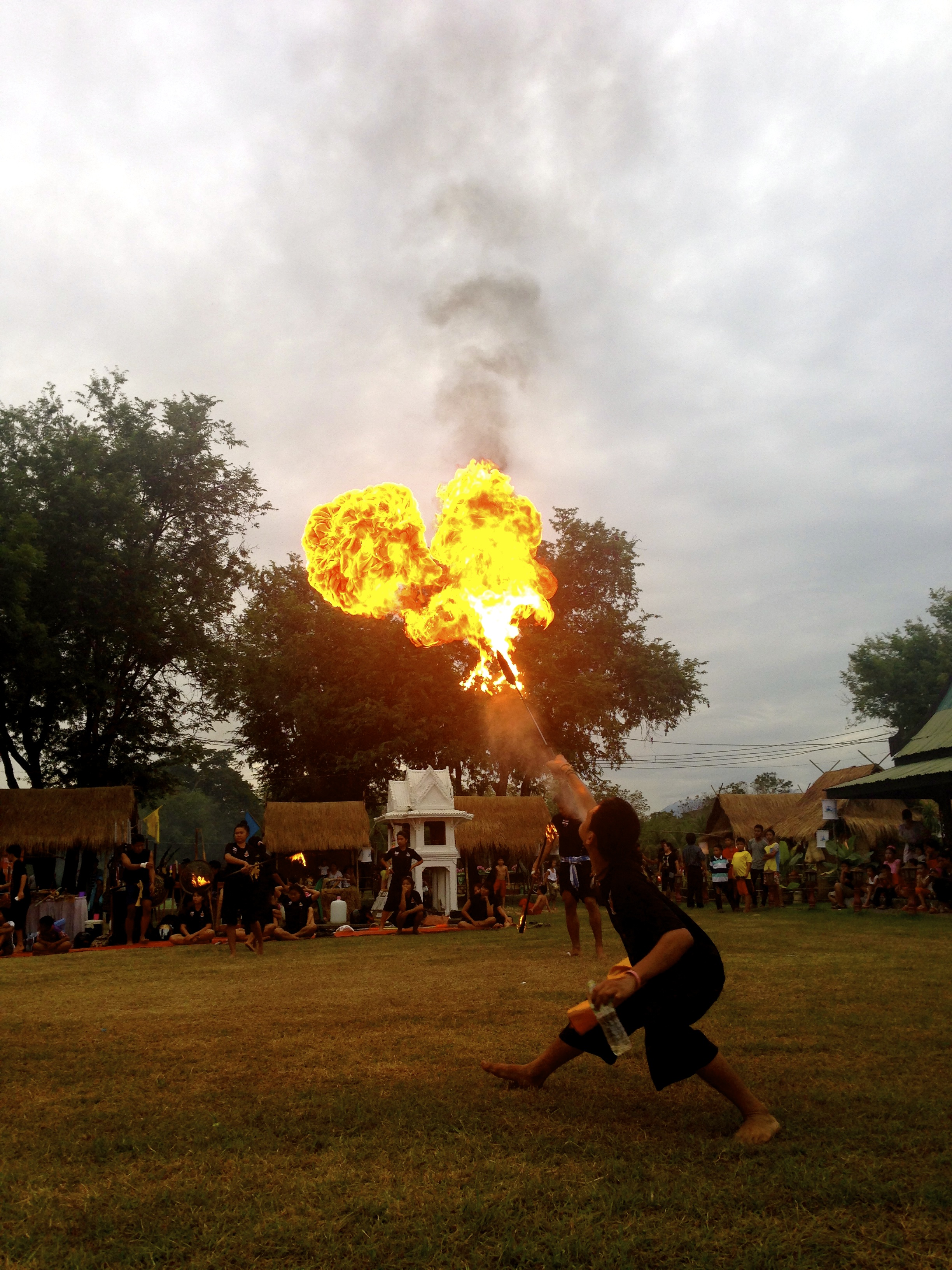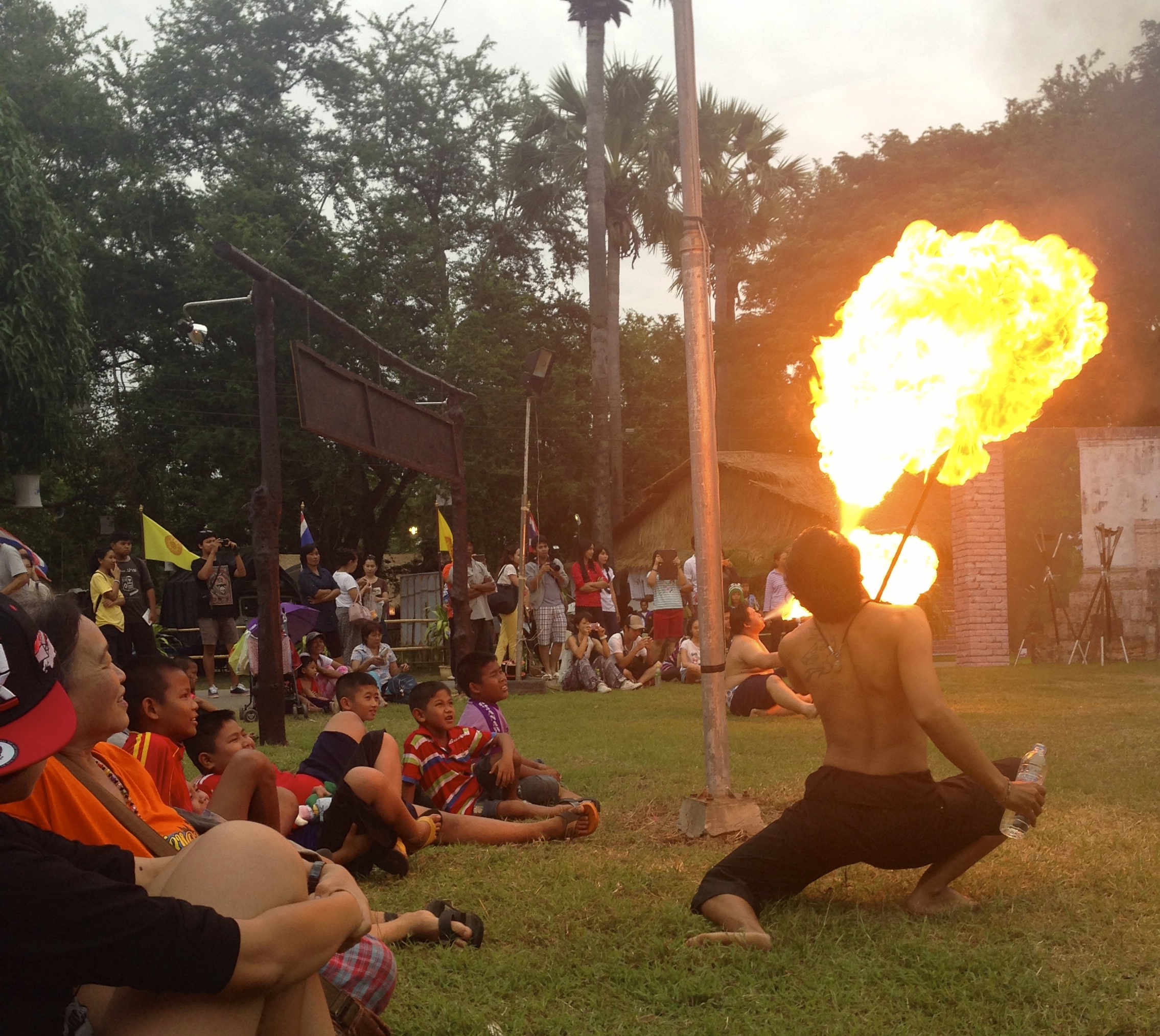 The park really does a wonderful job of bringing the experience to life. I caught myself saying “It’s like Disneyland!” a couple of times. Mostly due to the fact of the amount of effort that went into making the Loi Krathong event ‘genuine.’ Right down to having to exchange your money for seashells which are used to purchase freshly made Thai Iced tea from a guy on a boat and delicious Thai dishes. We also watched a staged Muay Thai boxing show put on by kids and some talented fire breathers.