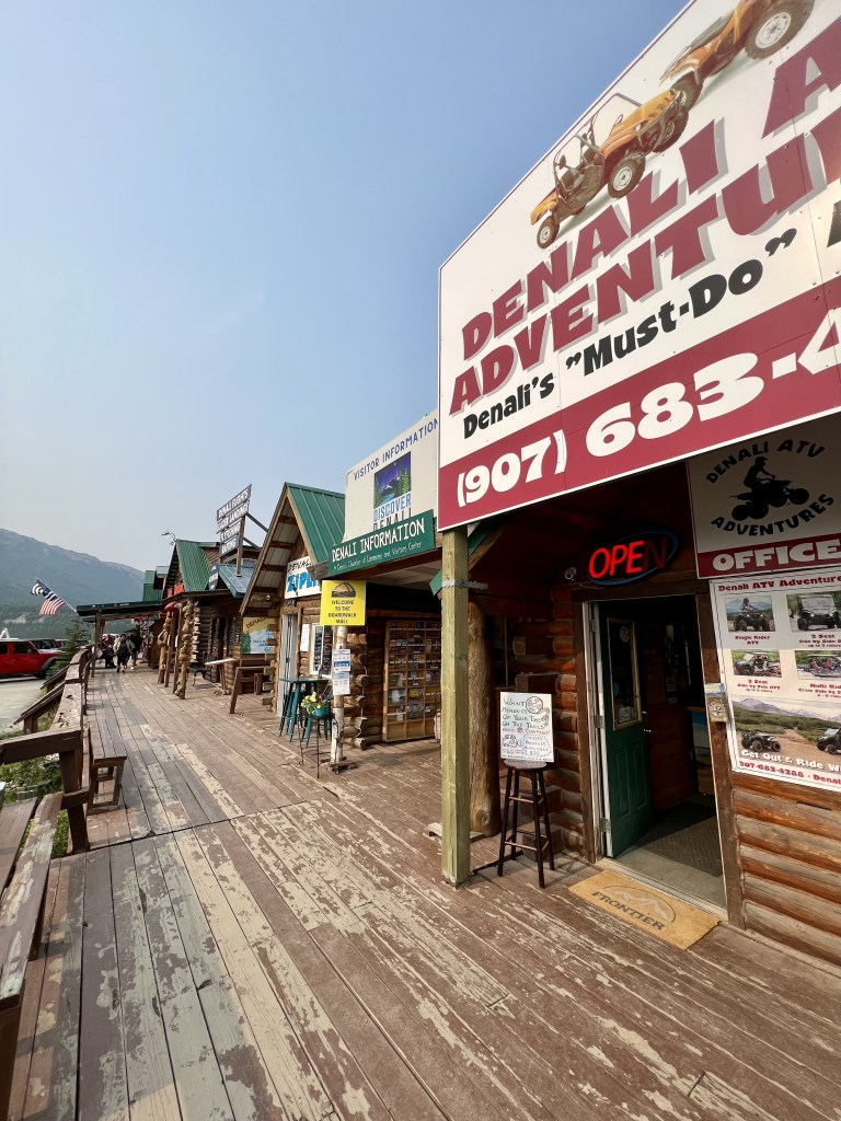The sky was somewhat smoky but not enough to completely distort our views of the land, river, and mountain range. Only 30% of visitors are able to get a glimpse of Denali, the coveted 30% club, so we weren’t too disappointed when we fell into the majority. Like most Alaska Railroad passengers, we opted to stay a night “in” Denali National Park.* We opted for the Denali Bluffs lodging, a hillside set of log cabin rooms overlooking the river and toward Denali National Park. We had a few hours to settle in and eat before our 9 pm Midnight Sun Adventure ATV Tour.