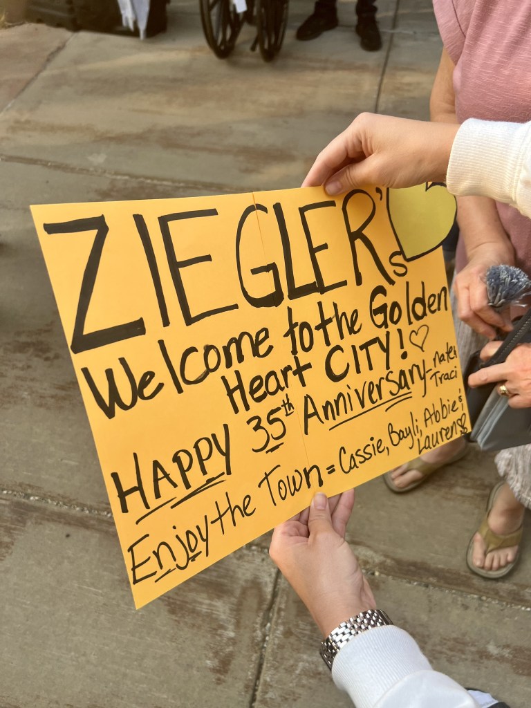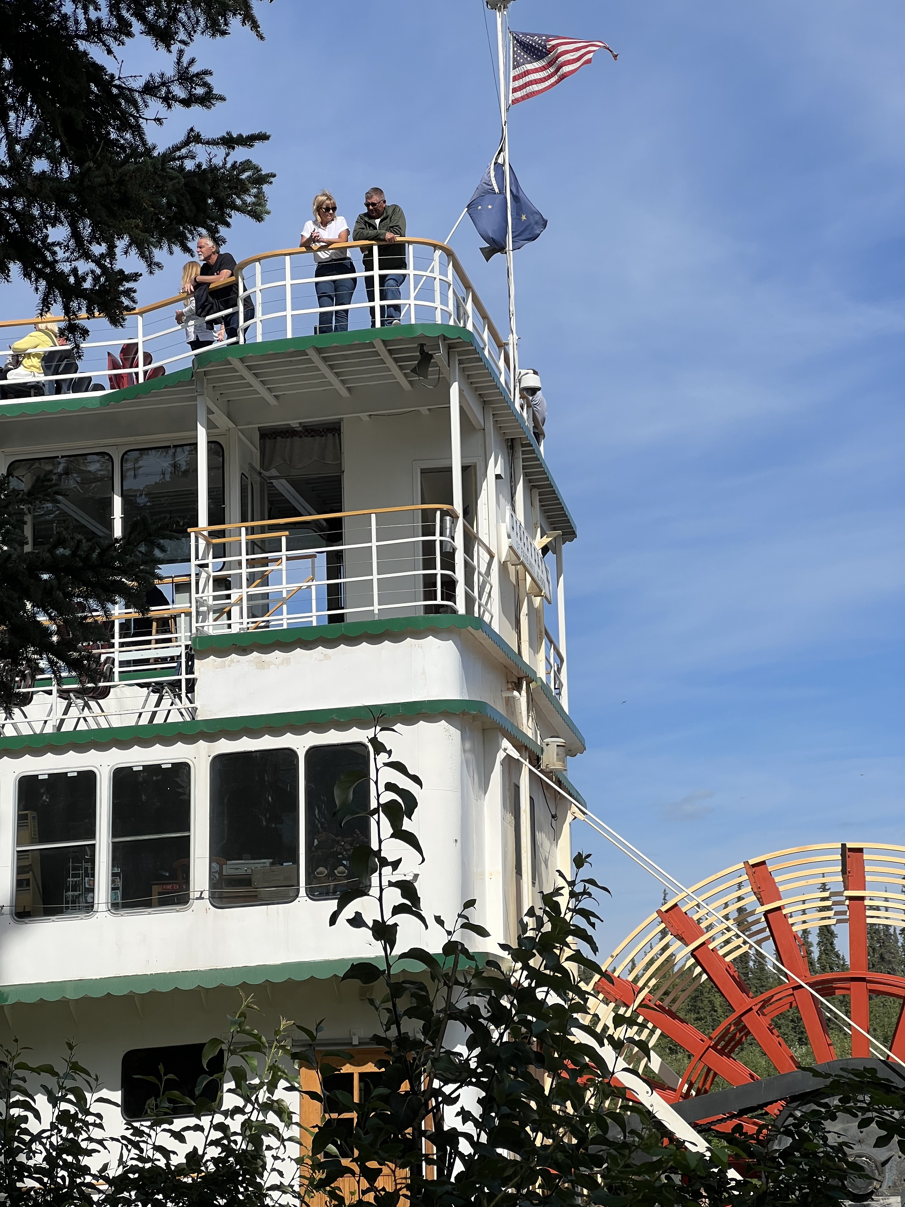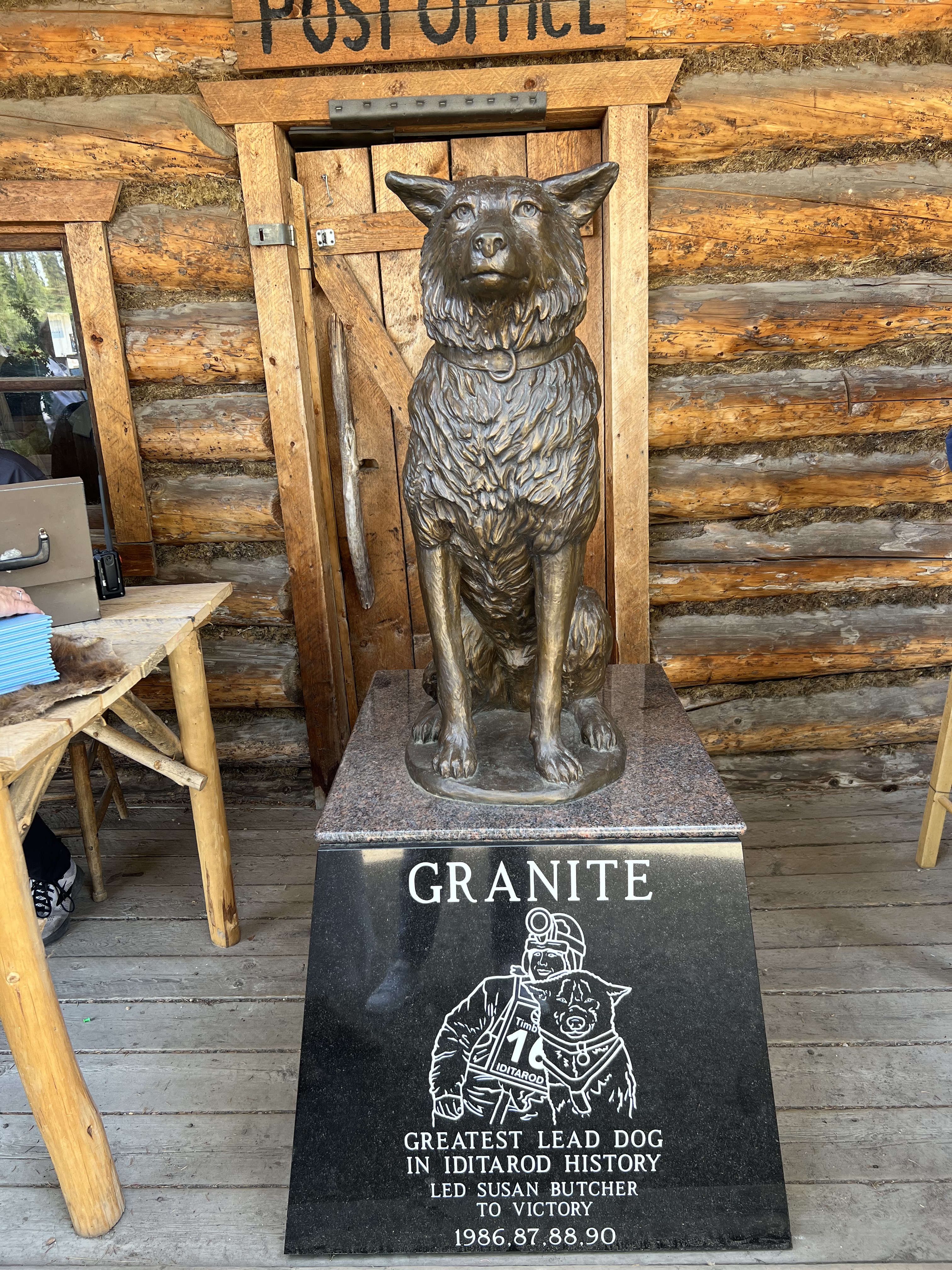 Friday brought more exciting discoveries and family history. We visited Pioneer Park, a 44-acre city park that offers a delightful journey into Alaska’s past, featuring historic buildings from the gold-rush era, a native village exhibit, and a vintage carousel. It’s a hub of activity with museums, art galleries, a miniature golf course, and even a narrow-gauge train that circles the park. It felt a little rundown and in need of some love, but it was a good way to fill an hour. Next, we made our way to Golden Heart Plaza, a scenic riverside park in the heart of downtown, known for its iconic “Unknown First Family” statue, beautiful flower gardens, and as a gathering place for community events and festivals. Here we would look for and find the names of my grandparents, my dad, and his siblings listed as one of the founding families.
