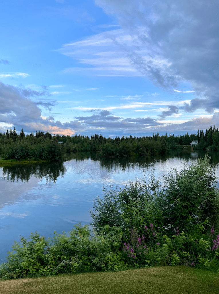 Back aboard the Denali StarTrain, we had four hours of golden-lit wilderness to gaze upon. At precisely 8 pm, as promised, the train pulled into the Fairbanks Depot, and the first of our family members were there waiting to greet us. We piled into our rental Suburban for the week and went straight to The Pump House for some welcome beers. The Pump House is a charming, historic restaurant situated on the Chena River, renowned for its delicious Alaskan seafood, warm hospitality, and stunning views. Then we were off for a sunny, midnight bedtime at our VRBO along the Chena River.