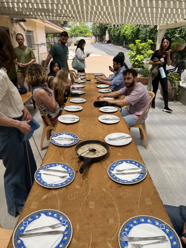 After a very full day, we returned to Jerusalem. On the way we made a pitstop at a lookout point and Paul, our fellow SIPA student and Israeli who was responsible for leading our group, bought a tray of his favorite dessert, knaffeh, to share with us all. Knaffeh is a traditional Arab dessert comprising layers of shredded phyllo dough and sweet cheese, all drenched in sugar syrup. From there, we headed to his alma mater, Shalem College. We engaged in a candid discussion with Kris Fresonke, Deputy Political Chief in the U.S. Office of Palestinian Affairs, U.S. Department of State. Several current university students joined our roundtable, and for dinner, we opted for a universal favorite—pizza. This quintessential student meal was fitting for our evening dialogue. After a day packed with in-depth exploration of politics, economics, and policy-making, we returned to our hotel for a much-deserved restful night’s sleep.