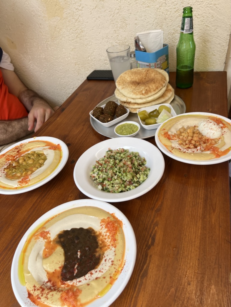 The next day began with a quest for coffee. A few of us followed a recommendation from Abigail and visited Tamati, after which we plunged into the vibrant chaos of the Carmel Market. Known as “Shuk HaCarmel”, this is Tel Aviv’s primary open-air marketplace, offering everything from fresh produce to eclectic goods, reflecting the city’s dynamic spirit. After purchasing spices for a homemade shakshuka, we discovered a quaint café in a side alley for a beer. Taking a cue from Eduardo again, our lunch choice was Asi ve Adnan, where the warm hummus, complemented with an egg and spicy sauce, was simply sublime.